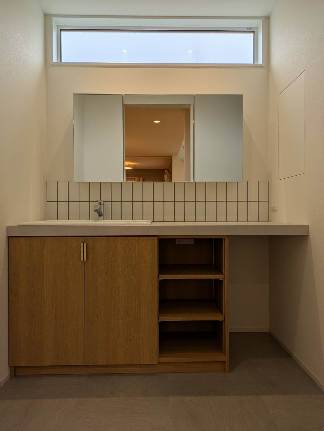 ↓造作洗面化粧台には薄いグレーの目地材を施工した白いタイルを合わせ、取手は真鍮カラー