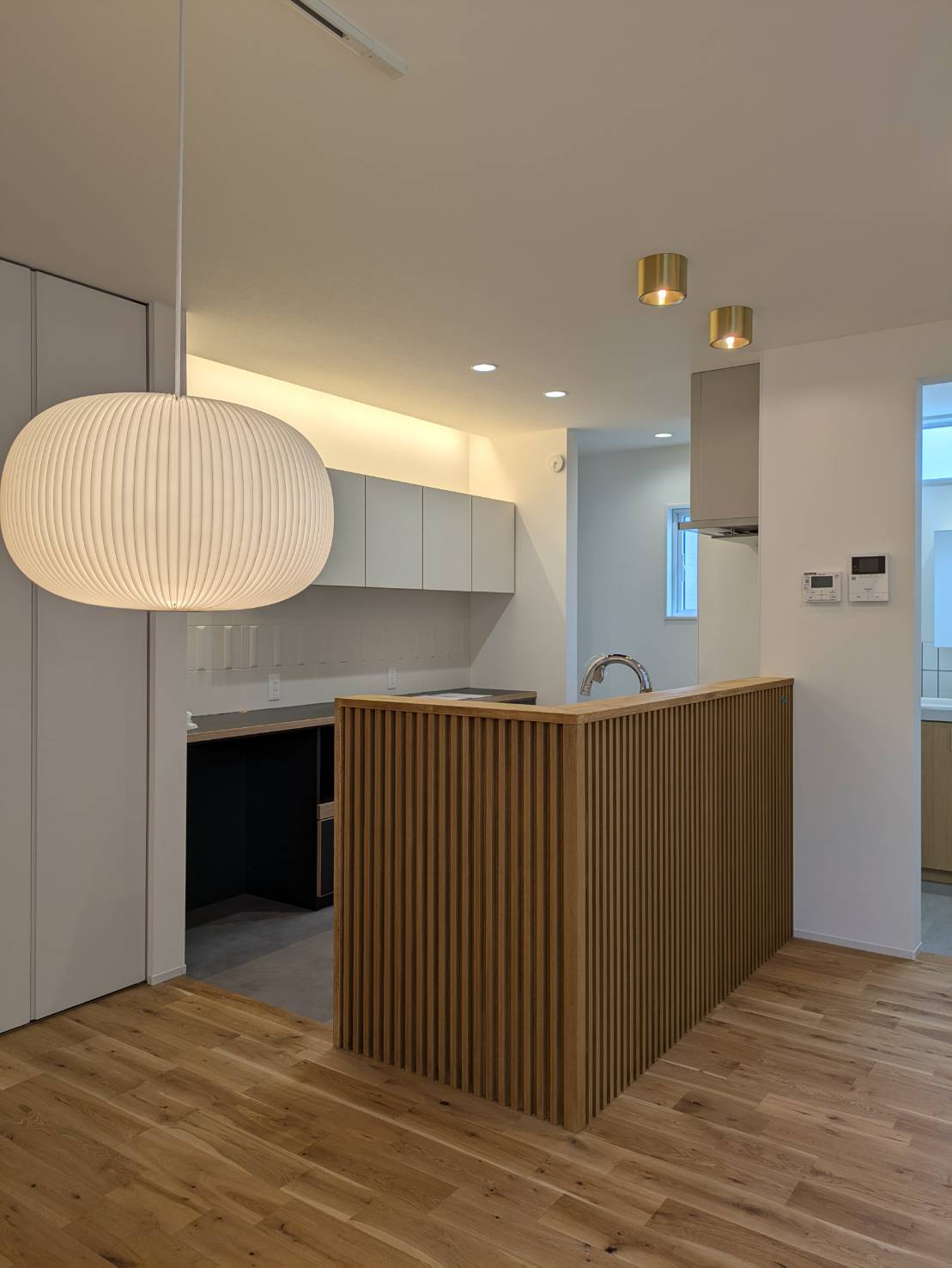 ↓木リブでデザインされたキッチンカウンター