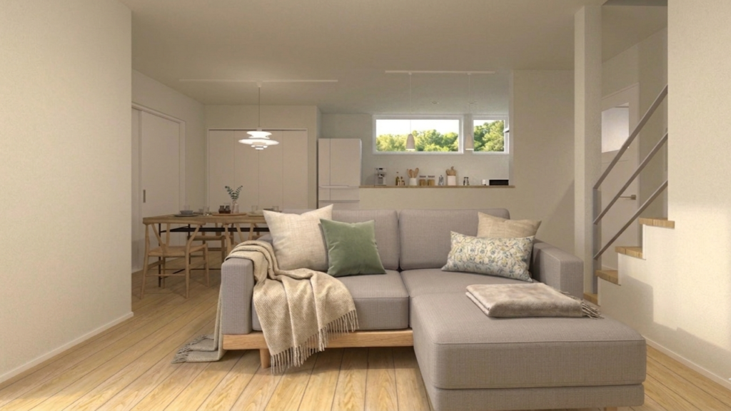 やさしいグレーの外観に、木目のぬくもりが映える上品な佇まい。室内は、淡い色合いと自然素材が調和した北欧ナチュラルな空間に仕上げました。